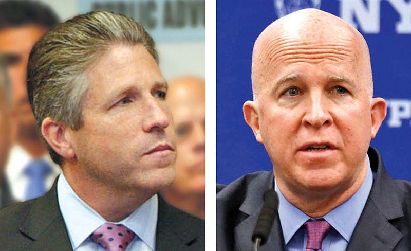 PASSIVE AGGRESSION ON PANTALEO?: While Police Benevolent Association President Pat Lynch (left) sounded more like a labor bureaucrat than the leader of a union representing people whose jobs carry risks, his warning that his members would refrain from engaging in possible use-of-force situations unless supervisors and Emergency Services Unit personnel were on hand put pressure on Police Commissioner James O’Neill (right) that may partly offset what he is feeling from Mayor de Blasio’s pledge of ‘justice for the Garner family’ in deciding whether to fire Daniel Pantaleo.