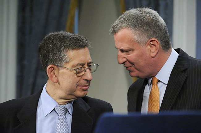 Labor Commissioner Robert Linn (l.) speaks with Mayor de Blasio in May 2015. (BARRY WILLIAMS/FOR NEW YORK DAILY NEWS)