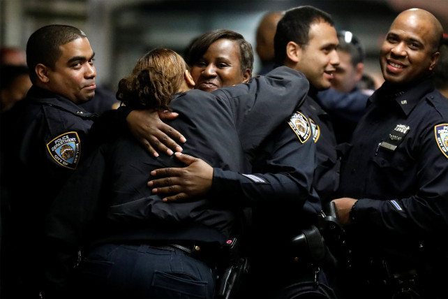 NYPD officers greet each other at Tyrone Howard’s sentencing in Manhattan Criminal Court.Reuters